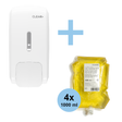 Das Aktionsset bestehend aus Cremeseifenspender und passender Cremeseife ist ideal für hoch frequentierte Waschräume. Der Seifenspender funktioniert ohne Batterien oder Strom und ist dank Push-Technologie leicht zu bedienen. Die Cremeseife mit Zitrusduft reinigt die Hände sanft und hinterlässt ein weiches und sauberes Gefühl. Die Cremeseife ist HACCP-konform und damit ideal für den Einsatz in hygienisch sensiblen Bereichen. Der Spender ist mit einem Fenster zur Füllstandanzeige an der Vorderseite ausgestattet. Die Nachfüllbeutel besitzen einen innovativen Druckverschluss, der das Auslaufen von Seifenresten beim Wechseln der Beutel verhindert.